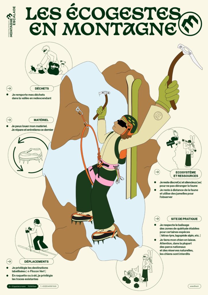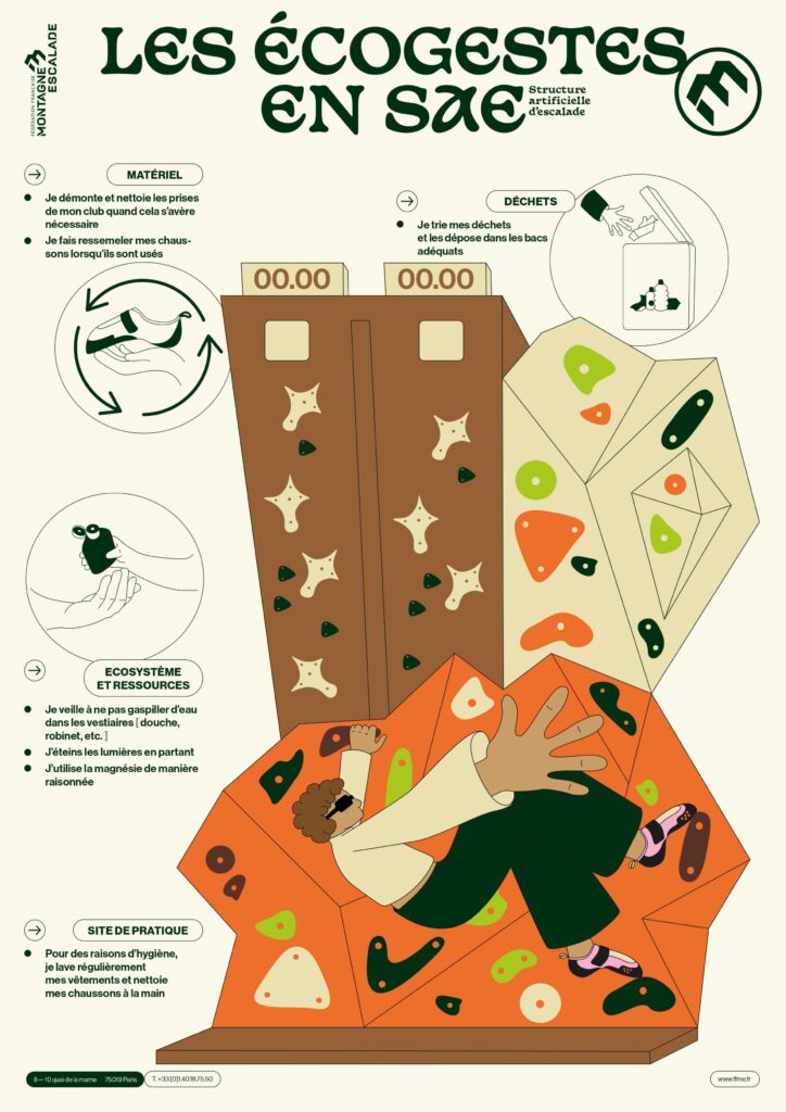 Pratiquer l’escalade, c’est aussi prendre soin des lieux et des personnes qui nous accueillent, en salle comme en extérieur; le SMUS Escalade relaye les affiches écoresponsables de la FFME et lance une dynamique club pour des pratiques plus sobres, respectueuses et conviviales.