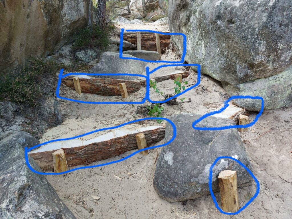 Ce week-end du 17 et 18 mai, nous avons travaillé avec une grande énergie à la restauration des abords d’un site de grimpe de Fontainebleau sur le parcours des 25 bosses au Rocher Fin. Au total, ce sont 18 participants, en partenariat avec l’Office National des Forêts, qui ont œuvré 1 ou 2 jours sur le site pour restaurer les sentiers et abords de blocs érodés par l’action humaine et l’érosion :